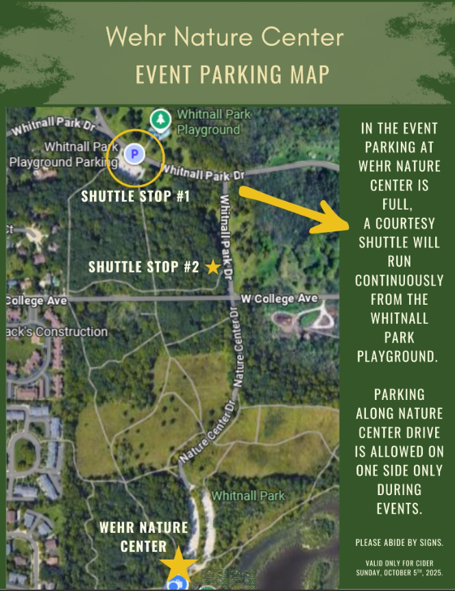 Yes, the Wehr Nature Center lot is first come first serve. If the lot becomes full attendees can park on one side of the Wehr driveway, on Whitnall Park Drive (only where allowed) or at the Whitnall Park Playground Parking Lot (Coordinates: 42.9207° N, 88.0331° W)