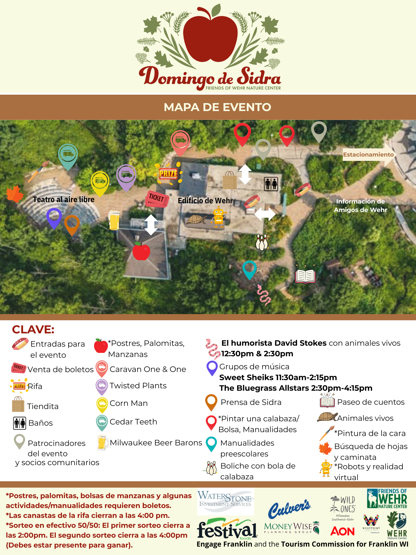 Domingo de Sidra (Cider Sunday) es la recaudación de fondos más importante de Friends of Wehr Nature Center y respalda la visión del centro de ser un líder regional en brindar acceso a la naturaleza para todos. Las ganancias benefician la programación educativa y la gestión de tierras que ayudan a hacer de Wehr Nature Center una joya natural en el sureste de Wisconsin. Celebre el otoño durante este evento familiar para todas las edades.